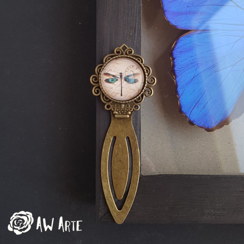 Wyjątkowa zakładka wykonana z wysokiej jakości metalu w kolorze antycznego brązu, zdobiona ręcznie szklanym oczkiem z motywem ważki. Idealny prezent dla miłośników książek i natury.
